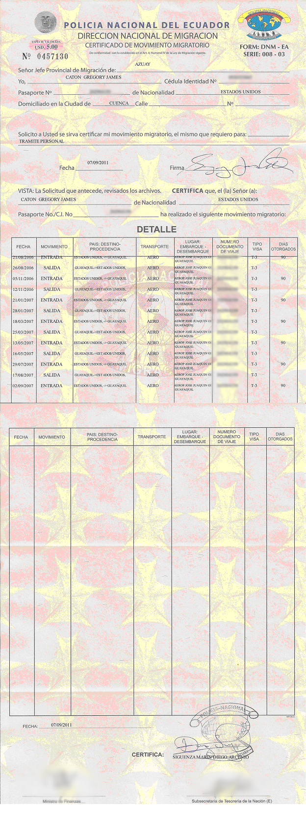 “Fecha” means date, and you can clearly see the date on this report is September 7, 2011 (it was produced just last week, when Caton returned to Ecuador). The last movement recorded on this document is from September 2, 2007, showing he entered Guayaquil from the United States four years ago.