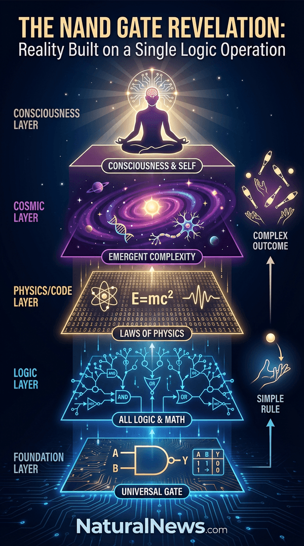 I believe it points to a computational substrate, a programmed universe. This isn’t speculation; it’s a logical inference from the evidence. The simplicity is eerie. As one science paper notes, “the two universal gates, namely NAND and NOR are independently able to perform all fundamental logic operations” [1]. But NAND alone suffices. That universality hints at a designed system infused with decentralized computation that infuses matter, neurology and light itself.